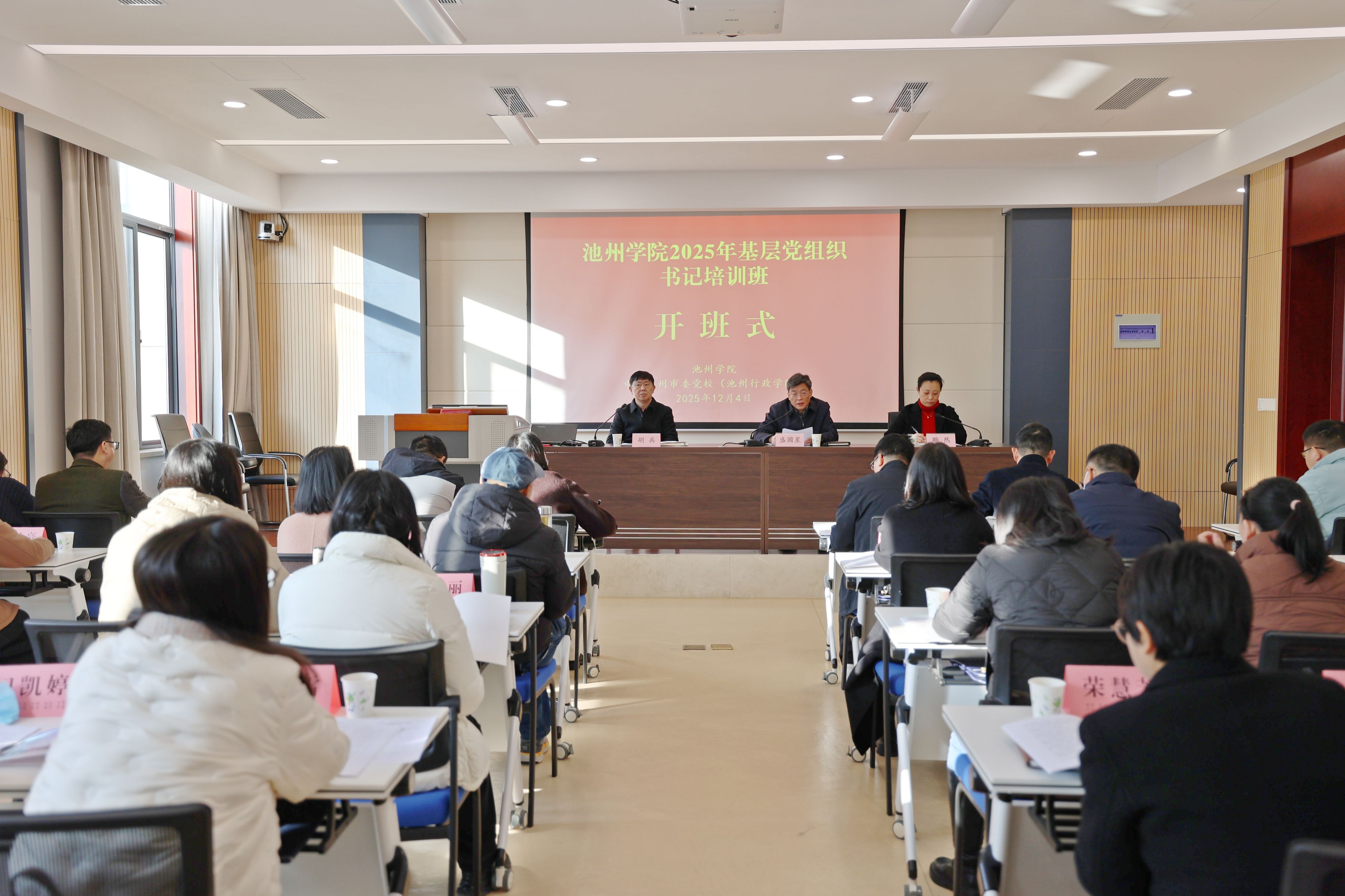 12月4日上午,池州学院2025年基层党组织书记培训班在池州市委党校正式开班。校党委副书记盛国星出席开班式并作动员讲话,池州市委党校教务处处长雕然致欢迎辞,校党委委员、组织部部长、党校常务副校长胡兵主持开班式。